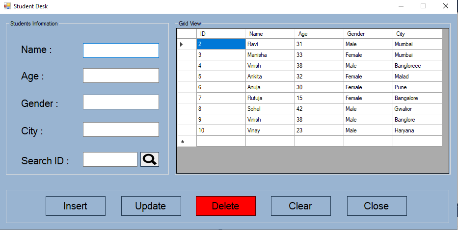 cmd = new SqlCommand("Update tblInformation set Name=@Name, Age=@Age, Gender=@Gender, City=@City where ID='" + txtSearch.Text + "'", conn);